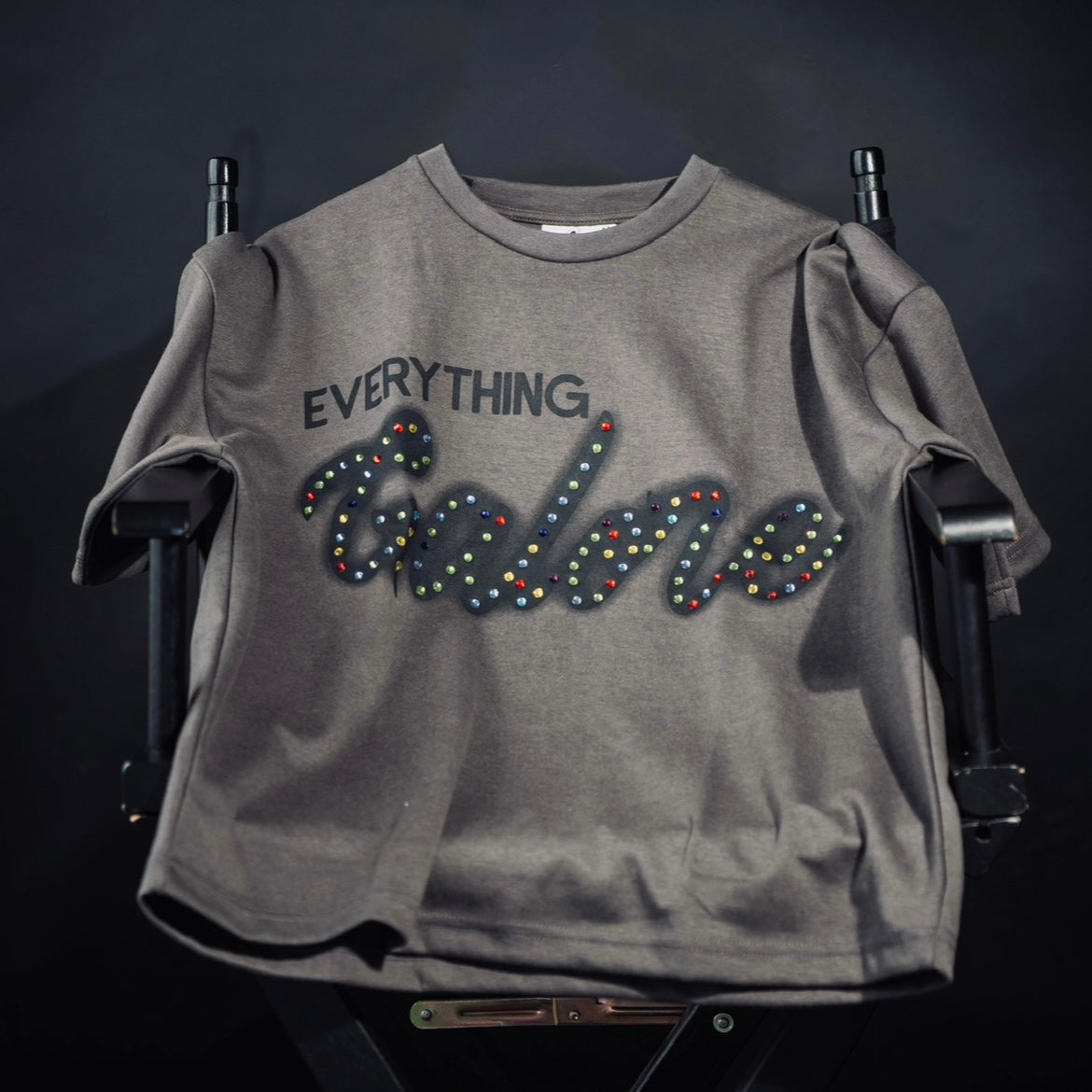 A standout piece crafted from soft, heavy-weight cotton in a relaxed box fit. Features an eye-catching "Galore" graphic with vibrant rhinestone accents in a vintage grey wash.